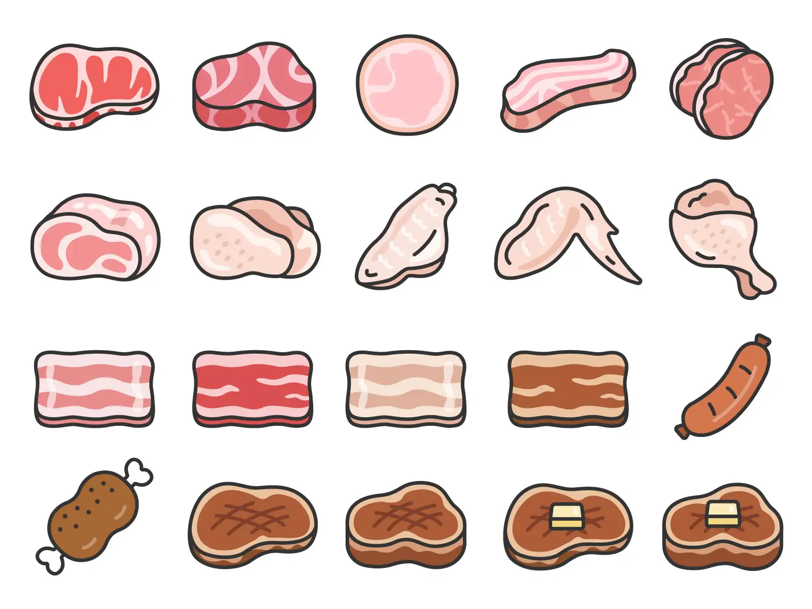 ![]() お肉のアイコンイラストセット(線画) | ![]() お肉のアイコンイラストセット(線画カラー) | ![]() お肉のアイコンイラストセット(縁無し) |