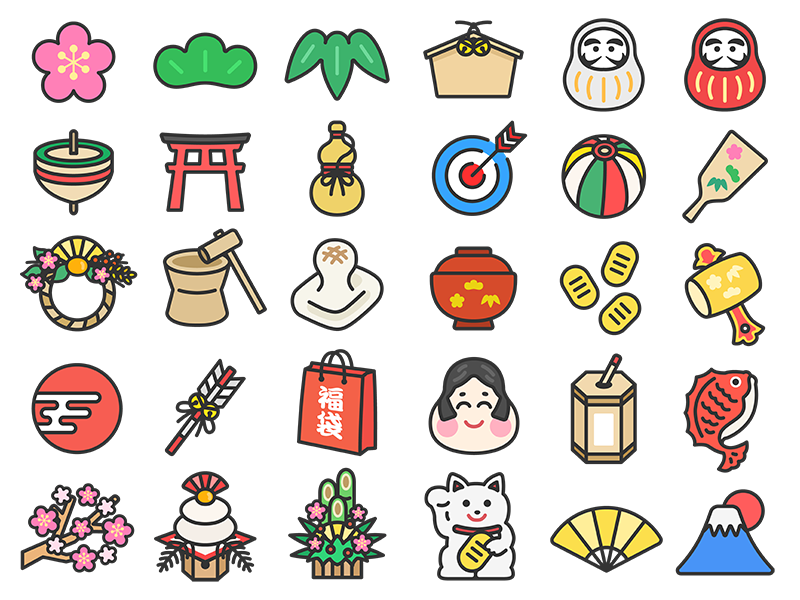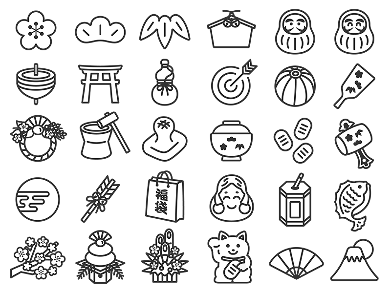 ![]() 正月のアイコンイラストセット(線画) | ![]() 正月のアイコンイラストセット(線画カラー) |