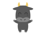 A free illustration of a Holstein cow character wearing a kimono and greeting people.