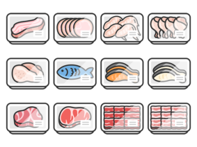 アイコンスーパーのパックに入った、鮮魚とお肉のアイコン(線画カラー)の無料イラストセット|透過PNG・商用利用OK